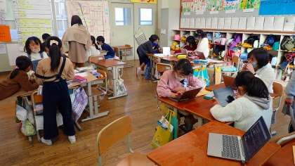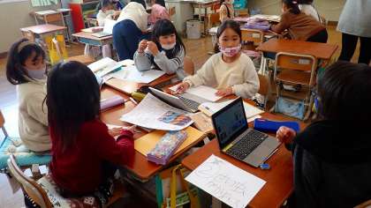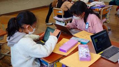 前の時間にクラスの友達からもらったアドバイスをもとに,よりよい発表になるように練り直しています。他の学校の友達に発表するときには,乾隆学区の様子がよく伝わる発表になるといいですね!