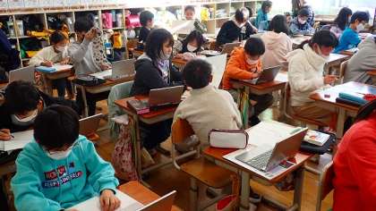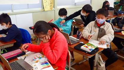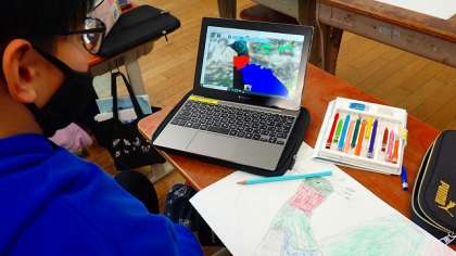 版画にする鳥の下絵を描き進めています。5年生は,彫り進みの多色版画に取り組んでいるので,どんな色の作品にするのかイメージを持つことが大切です。GIGA端末を使って画像に色を乗せてみながら,仕上がりのイメージを確かめています。