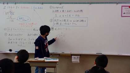 集団解決では,どうして計算を途中で止めて答えを求めるのかについて,理由を説明しました。1人だけではなく,何人もの友達の説明を聞くことによって,より理解が深まります。対話し,考えを深める子どもたちの姿が見られました。