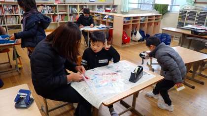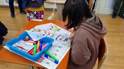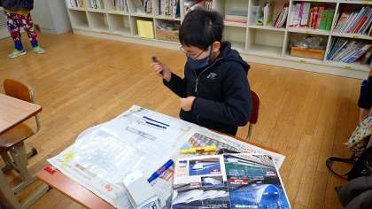 お正月の遊びである「たこ」をつくっています。自分の好きな絵を凧に描いています。出来上がった凧が浮くかどうか確かめていました。