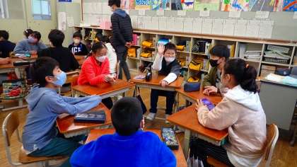 5年生は,席替えをしました。新しく同じ班になって友達と,班の中の役割分担について話し合っています。久しぶりに会う友達と,和気あいあいと話し合いを進めていました。
