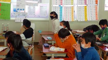 今日は,「どこかで」を聴き,楽曲の特徴をとらえる学習をしました。1番から4番まで季節の順に歌われていることや,2番以降は輪唱で歌われていることに気付いていました。