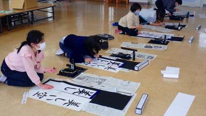 書いた文字は,「美しい空」です。普段の半紙よりも長い画仙紙に書きます。また,床に正座して書くので,姿勢も普段とは違います。これまでの学習を生かして,ていねいに書いていました。
