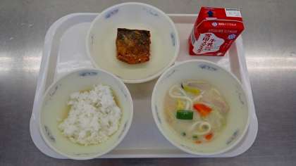 今日は,1年に1回だけの献立の「豆乳なべ」でした。楽しみにしていた子どももたくさんいたようです。豆乳,信州みそや白みそで,豚肉やにんじん,白ねぎなど,たくさんの具材が煮込んで作りました。食器いっぱいの豆乳なべを,みんな喜んで食べていました。