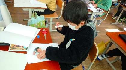 これまでの自分の成長をふり返り,画用紙にまとめています。おうちの方に用意していただいた写真を見ながら,「○歳のときはこうだったなあ」「こんなときもあったなあ」と思い返しながらまとめていました。