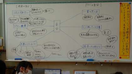 この単元では,将来の自分についてスピーチをする「未来の自分スピーチ会」を開くことを目標に学習を進めていきます。「今の自分」についてふり返り,「将来の自分」のイメージを明確にもつために,思考ツールを使って考えを広げ,交流しました。