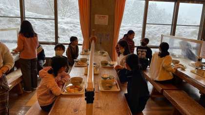 散策と雪遊びの後は,食堂で昼食をいただきます。昼食は,あたたかいきつねうどんです。外の気温は「マイナス1度」だそうですが,あたたかいうどんを食べると,体もぽかぽか温まります。