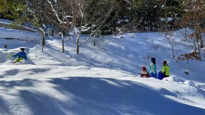 雪に埋もれたり雪玉を投げたりしながら,雪の感触を楽しんでいます。空もきれいに晴れ渡り,とても気持ちよさそうです。