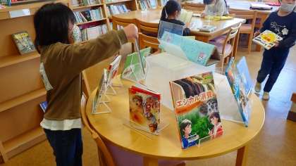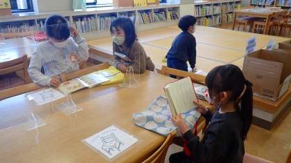 1年生は,図書室で本を読んでいます。図書ボランティアさんのおすすめの本を手に取り,興味深そうにページをめくっていました。