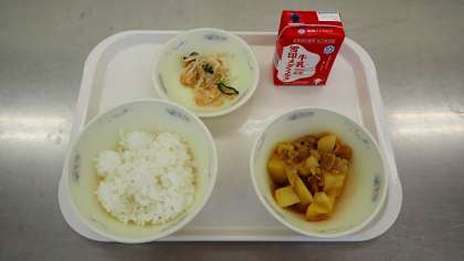 子どもたちの大好きな「肉じゃが」ですが,今日はカレー味の肉じゃがでした。カレーのピリッとした辛さが,食欲をそそります。「もやしの煮びたし」は,もやしのシャキシャキとした食感を楽しんでいただきました。