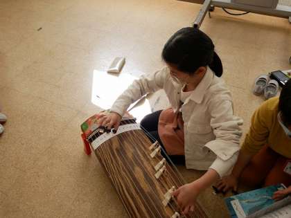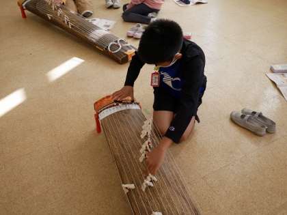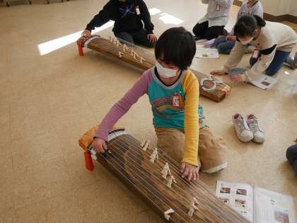 初めて触れる筝に少し緊張気味の子どもたち。