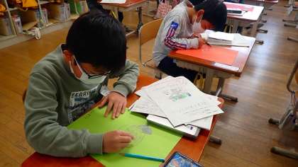 2年生は,この1年間,生活科の学習で書き溜めたカードを綴じる冊子を作っています。表紙には,みな思い思いの絵を描きました。