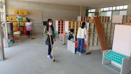 それぞれの分担場所を確かめた後は,そうじや準備を進めています。2週間,使われなかった教室や廊下,体育館はほこりがたまっています。隅々まで心をこめてきれいにしています。