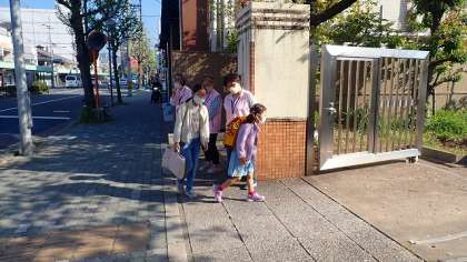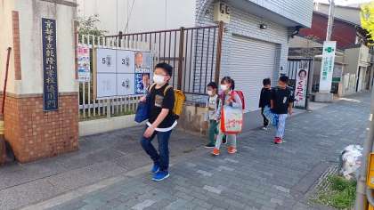 お兄ちゃんやお姉ちゃんと一緒に,近くに住んでいる上級生と一緒に,元気に歩いて登校しました。今日は,教室でどんなことをするのかな?