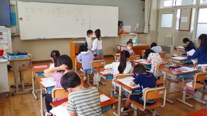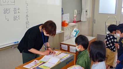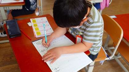 2年生になって,学習する漢字の数も増え,難しい漢字も多くなります。書き順や字形に気をつけて書いています。ていねいに書けているかどうか,先生に確かめてもらいました。