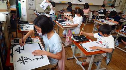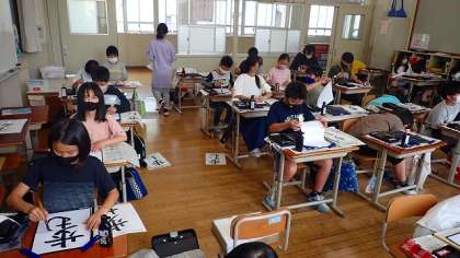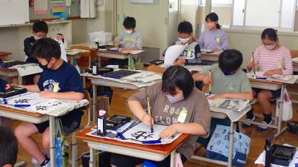今日の課題は「歩む」の2文字です。お手本をよく見ながら,文字の大きさと配列に気をつけて書きました。
