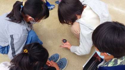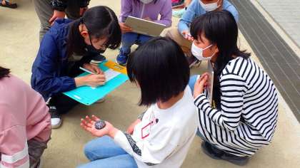 天気の変化に関わる「雲」はどのように動いているのかを確かめるために,運動場に出て観察しました。方位磁針を使って方位を確かめ,雲がどちらの方角から移動しているかを確かめました。