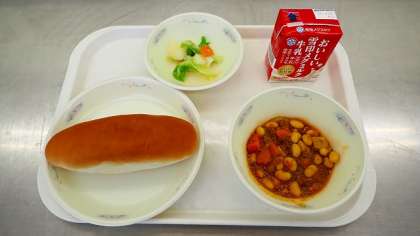 「チリコンカーン」は,牛ひき肉とたっぷりの大豆,野菜をカレー風味に味付けしています。「野菜のソテー」はさっぱりした味付けで,食べ合せがよくどちらもおいしく親抱きました。