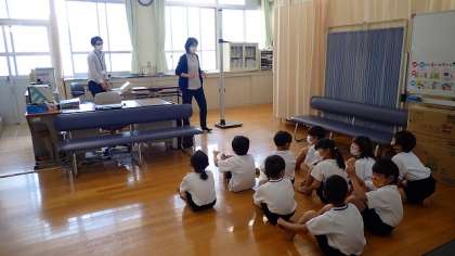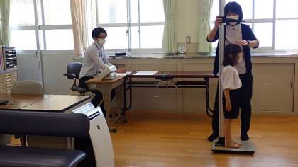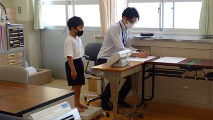 保健室の先生に身長を測ってもらい,その後担任の先生に体重を測ってもらいました。これから1年間で,どれだけ大きく成長するか楽しみですね。