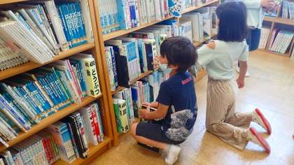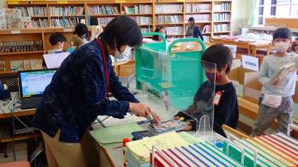 今年度から新しく来てくださった司書の先生に,貸し出しの手続きをしていただきました。2年生でも,100冊読破をめざしてがんばってほしいと思います。
