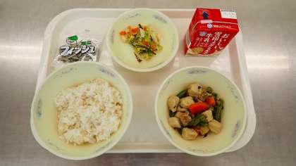 「高野どうふと野菜のたき合わせ」は,高野どうふと鶏肉のほか,にんじん,三度豆,干ししいたけなどの野菜がたっぷり入っています。高野どうふだけでなく,野菜にもしっかり味がしみこんでおり,ごはんと一緒に食べるととてもおいしい献立でした。