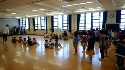 まず,「小犬のビンゴ」に合わせて,歌ったり手拍子を打ったりして楽しみました。1年生の子どもたちも,2年生に合わせて体を動かしたり,手拍子を打ったりしました。