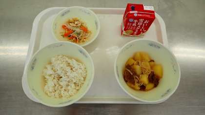 「肉じゃが」は,子どもたちの大好きな献立です。牛肉とじゃがいもに味がよく染みこみ,ごはんによく合う献立でした。「もやしの煮びたし」は,もやしのシャキシャキした食感を楽しんでいただきました。