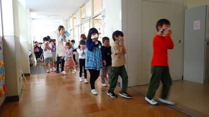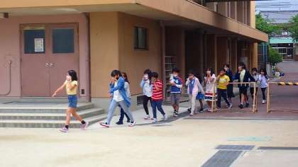 「理科室より出火」にため,火災現場から遠い安全な経路を通って運動場に避難しました。みんな「お・は・し・も・て」の合言葉を守って整然と避難しました。