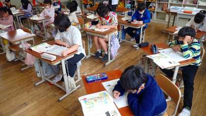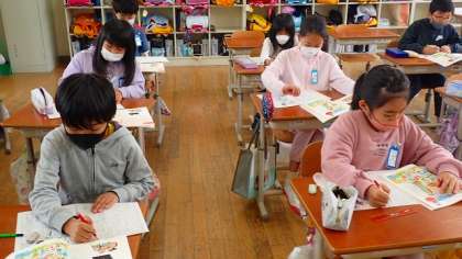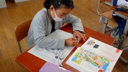 3年生までに学習した漢字が定着しているかを確かめる学習です。教科書の挿絵を見て,その様子を漢字を使った文で書き表しました。教科書のページに出ている漢字全部を使おうと,一生懸命取り組んでいました。