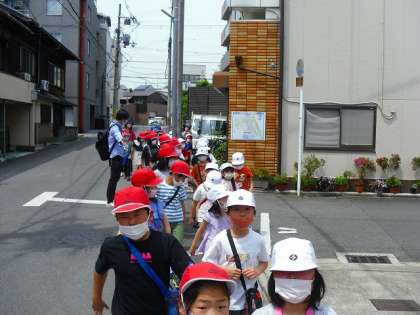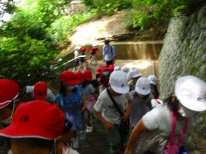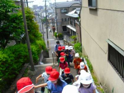 1年生も2年生も,約束を守って道路を歩きました。船岡山が近付いてくると,道も少しずつ上り坂になってきます。階段も,へこたれずに上りました!