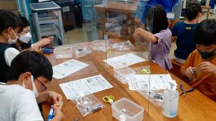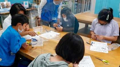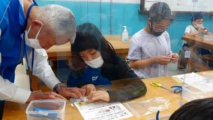 抵抗器をステープラーで留めるのが難しく,苦労していますが,モノレンジャーの先生のアドバイスをもらいながら,みんな自分の力でがんばっています。