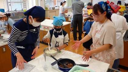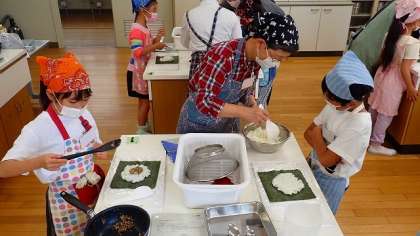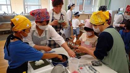 さばそぼろをごはんに乗せ,海苔で包んで「おにぎらず」のできあがりです。