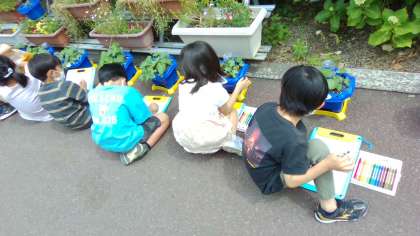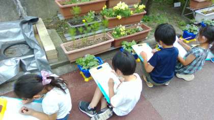 目で見て,触って,においを嗅いで観察し,「アサガオさん,もっと大きくなってね。」と話す子もいました。