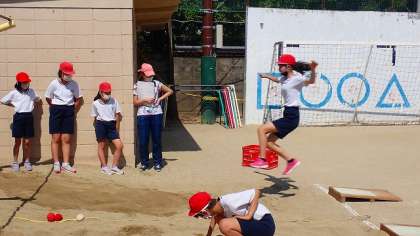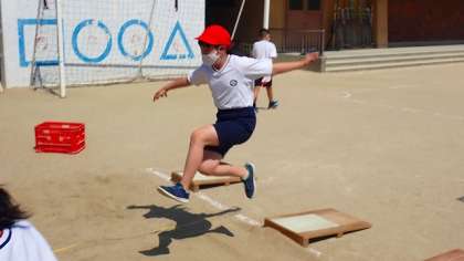 リズミカルに助走をすることや,踏み切りを合わせることなどのポイントに気をつけて練習しています。思い切りのよい踏み切りができると,遠くまで跳ぶことができますが,だんだん慣れてきたようで記録を伸ばしている子がたくさんいました。