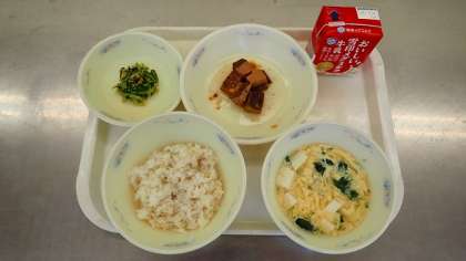 「なま節のしょうが煮」は,うま味のぎゅっと詰まったなま節にしょうがの風味が効いており,ごはんに合う献立でした。「かきたま汁」は,だしの味わい深いお汁にふわふわのたまごが合わさり,味わっておいしくいただきました。