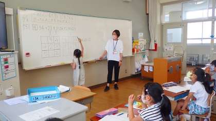 今日は,一の位がくり上がるたし算の筆算のやり方について考えました。くり上がった「1」をどのように処理すると正しい答えが求められるかについて考えを出し合い,みんなで解決していこうとする姿が見られました。友達の意見に「付けたし」て考えを伝える姿も見られました。