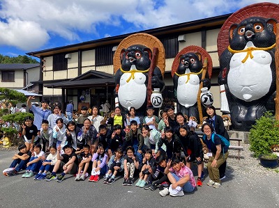 ここでは,湯飲みに絵付けの体験をさせていただきます。まずは,大きな信楽焼のたぬきの前で記念写真です。