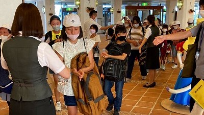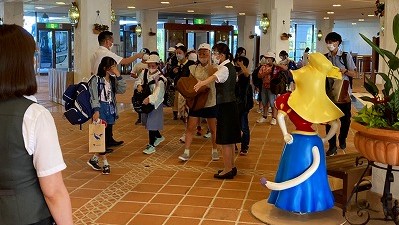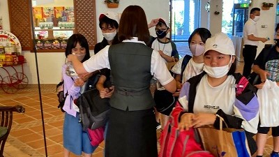 バスに積んでいた荷物を持って,入館します。入館時には,アルコール消毒をしました。