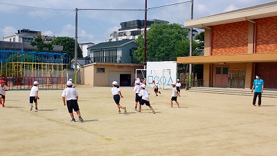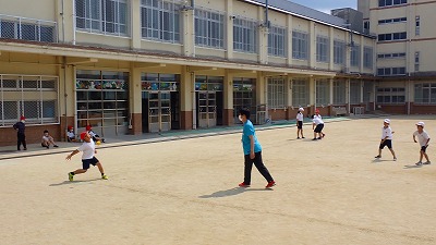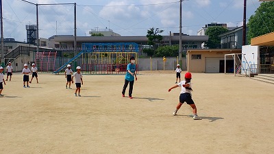 先生のトスするボールをよく見て,手で打ち返します。野球型のゲームは,ルールが難しく,プレーするときに戸惑ってしまがちですが,みんなで声をかけ合って楽しく学習を進めていました。