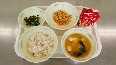 「おからツナどんぶりの具」はごはんに混ぜて食べます。甘く味付けされたまぐろやにんじん,干ししいたけなどがごはんとよく合い,おいしくいただきました。「みょうがのみそ汁」には,みょうがが入っています。さわやかな香りと,シャキシャキした食感を楽しんでいただきました。