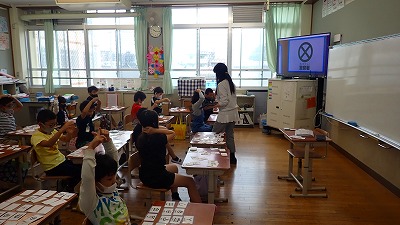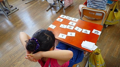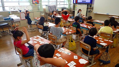 今日は,地図に使われている地図記号がどれだけ身に付いているかを確かめました。机の上にカードを並べ,先生の指示する記号を素早く取っていきます。たくさんある地図記号ですが,しっかり覚えることができているでしょうか?