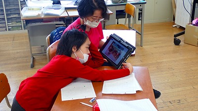 修学旅行の写真を見て,その時の様子をふり返っていました。