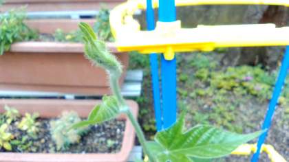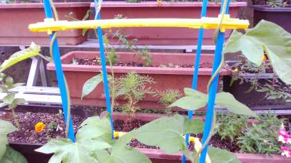 アサガオのつるが伸び,支柱に巻き始めました。