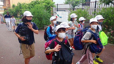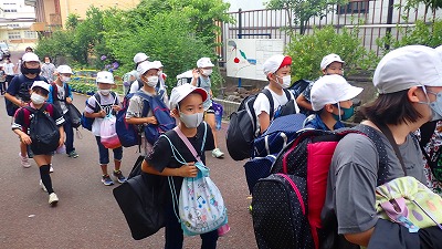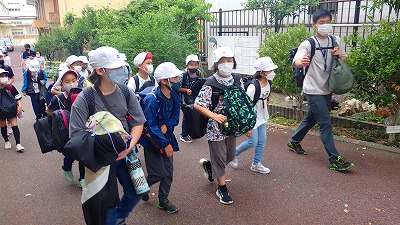 1泊2日とは言え,野外活動があるので荷物は大きめになります。4年生の子どもたちにとっては重い荷物ですが,しっかり持って歩きます。