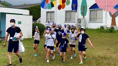 今日の午後のプログラムは,「いかだづくり体験」です。用意を整えて,外に出ました。