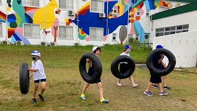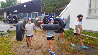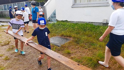 まずは,みんなで協力していかだの材料を運びます。たくさんの材料ですが,しっかり分担して運んでいます。