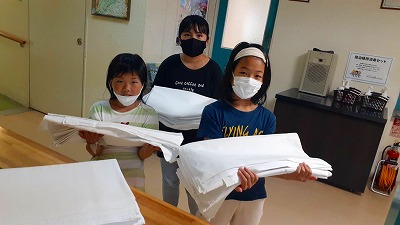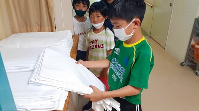 リネン室でシーツを受け取り,自分たちの寝床の準備をします。しっかりできたかな?