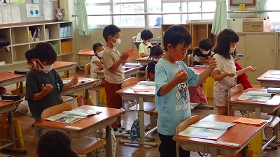 「かたつむり」や「ぶんぶんぶん」などの曲にリズム打ちを合わせて歌いました。いろいろなリズムを打ちましたが,「たん・うん・たん・うん たん・たん・たん・うん」のリズムが難しかったようです。