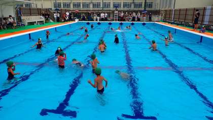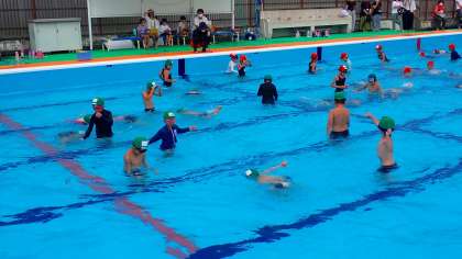 今日は、プールの底に沈んだゴムのキューブを集める「宝さがし」をしました。プールの底の「宝もの」を拾うためには、水に顔をつけなければなりません。顔をつけるのがちょっと苦手な子も、宝ものを拾うために一生懸命がんばりました。