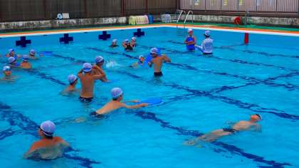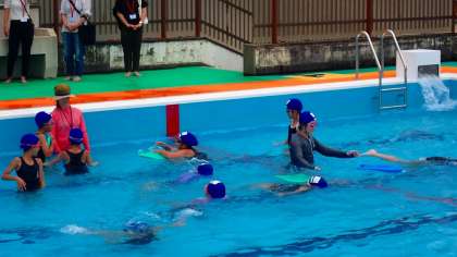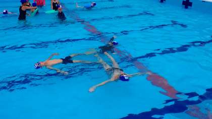 「背浮き」で体を浮かせる練習をしています。力を抜くと、自然に体が浮き、顔を水面から出すことができます。大の字になって体をうまく浮かせることができました。